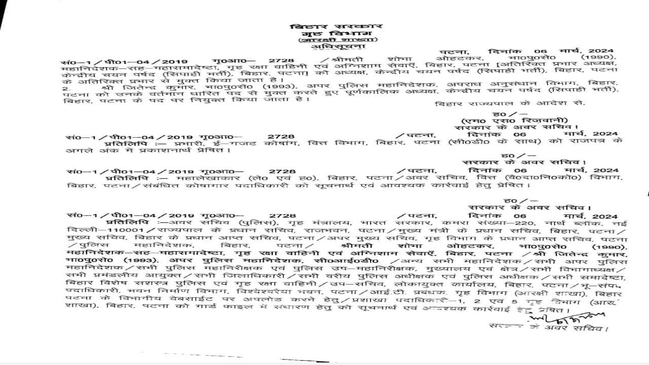 पटना : बिहार के दो आईपीएस अफसर को बड़ी जिम्मेवारी मिली है। आईपीएस अधिकारी जितेंद्र कुमार को अपर पुलिस महानिदेशक अपराध अनुसंधान विभाग पटना को वर्तमान धारित पद से मुक्त करते हुए उन्हें पूर्णकालिक बिहार केंद्रीय चयन परिषद सिपाही भर्ती बोर्ड का अध्यक्ष नियुक्त किया गया है। वहीं शोभा अहोतकर पुलिस महानिदेशक बिहार गृह रक्षा वाहिनी को अध्यक्ष पद से मुक्त किया जाता है।