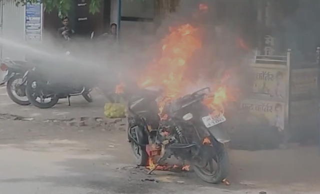 Fire : और बीच सड़क पर खड़ी बाइक में अचानक लग गई आग, धूं-धूं कर…..