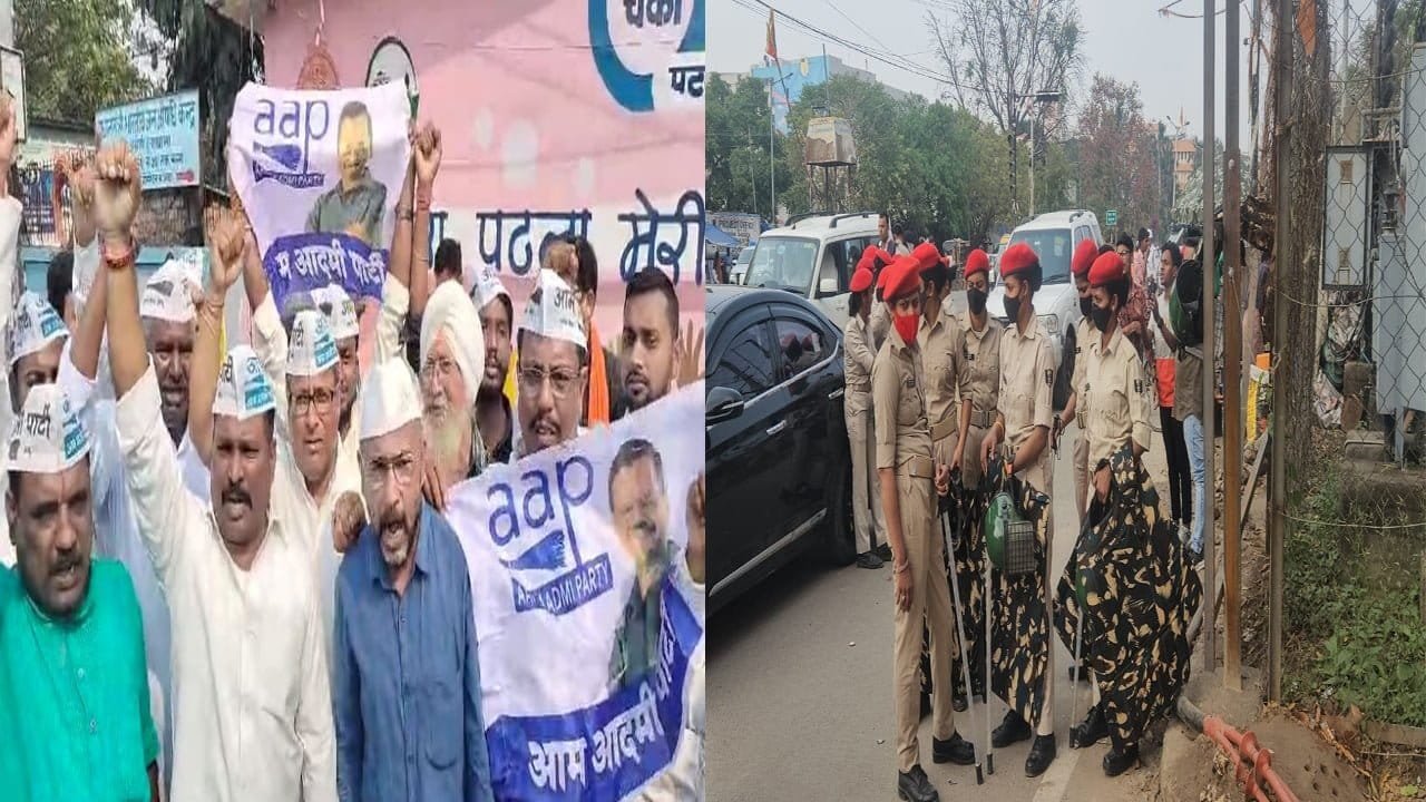 केजरीवाल के समर्थन में बीजेपी कार्यालय के बाहर AAP का प्रदर्शन