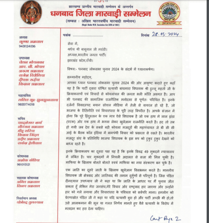 इसी को लेकर धनबाद जिला मारवाड़ी ने भी अपनी नाराजगी जाहिर की है। मारवाड़ी जिला सम्मेलन के जिलाध्यक्ष कृष्णा अग्रवाल ने भाजपा प्रत्याशी ढुलू महतो के खिलाफ बीजेपी प्रदेश अध्यक्ष बाबूलाल मरांडी को चिट्ठी लिखी है। पार्टी के राष्ट्रीय अध्यक्ष को भी इसकी प्रतिलिपि भेजी गई है।