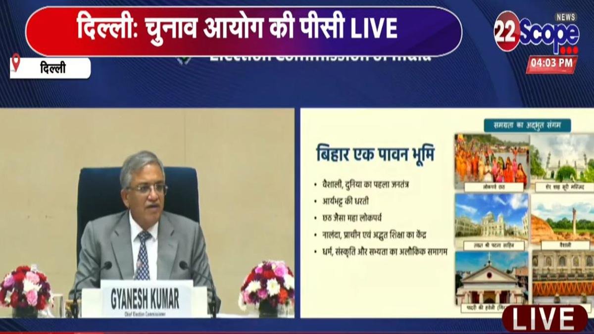 दिल्ली : बिहार विधानसभा चुनाव का बिगुल बज चुका है। मुख्य चुनाव आयोग ज्ञानेश कुमार ने प्रेसवार्ता कर बिहार चुनाव का ऐलान किया है। बिहार में दो चरणों में विधानसभा चुनाव होगा। छह नवंबर और 11 नवंबर को चुनाव होगा जबकि मतगणना 14 नवंबर को होगी। बिहार चुनाव को लेकर मुख्य चुनाव आयुक्त ज्ञानेश कुमार समेत कई चुनाव अधिकारी शाम चार बजे से प्रेस कॉन्फ्रेंस कर रहे हैं। चुनाव की घोषणा होते ही पूरे बिहार में आदर्श चुनाव आचार संहिता लागू हो गई है।