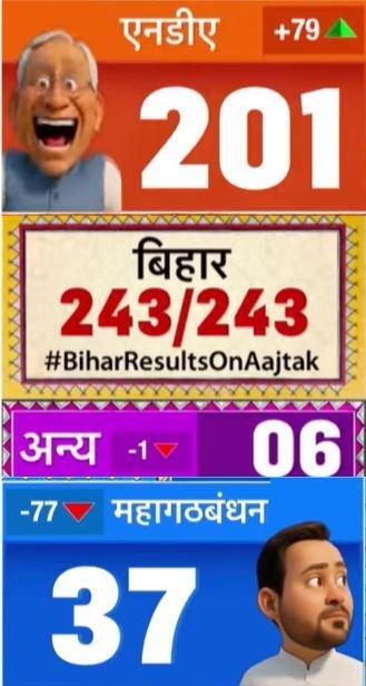 Bihar Election Result 2025: पटना: बिहार विधानसभा चुनाव 2025 के रुझानों में तस्वीर अब लगभग साफ नजर आने लगी है। एनडीए ने 200 से अधिक सीटों पर बढ़त बनाकर चुनावी मैदान में डबल सेंचुरी ठोक दी है। भाजपा 91 सीटों तक पहुंच चुकी है, जो 2010 के उसके सबसे मजबूत प्रदर्शन के समान है। वहीं जेडीयू भी 81 सीटों पर आगे चल रही है, जिससे गठबंधन को मजबूत बढ़त मिली है। उधर महागठबंधन का प्रदर्शन काफी कमजोर नजर आ रहा है और कई महत्वपूर्ण सीटों पर उसके उम्मीदवार पिछड़ रहे हैं।