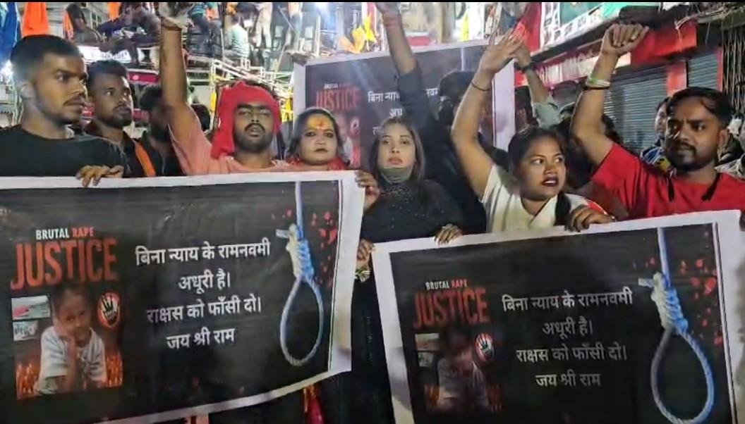 Hazaribagh: Bishnugarh थाना क्षेत्र में नाबालिक बच्ची के साथ दरिंदगी और फिर उसकी हत्या मामले को लेकर बच्ची के लिए न्याय दिलाने की मांग के साथ यूथ कांग्रेस के सदस्यों ने हजारीबाग की विश्व विख्यात रामनवमी में बैनर पोस्टर के साथ प्रदर्शन किया और यह मांग किया कि अपराधी को जल्द से जल्द गिरफ्तार करके उसे फांसी की सजा दी जाए नहीं तो रामनवमी मानना व्यर्थ है।