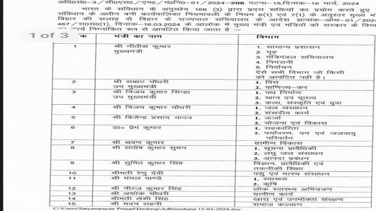 पटना : बिहार सरकार की कल यानी शुक्रवार को मंत्रिमंडल विस्तार हुआ था। राजभवन में कुल 21 मंत्रियों ने मंत्री पद की शपथ ली थी। लेकिन अभी ताजा खबर यह निकलकर आ रही है कि सभी मंत्रियों का विभागों का बंटवारा हो गया है। बता दें कि सीएम नीतीश कुमार के पास सामान्य प्रशासन, गृह, मंत्रिमंडल सचिवालय, निगरानी, निर्वाचन के साथ-साथ ऐसे सभी विभाग जो किसी को आवंतटित नहीं है। डिप्टी सम्राट चौधरी को वित्त और वाणिज्य-कर, डिप्टी सीएम विजय कुमार सिन्हा को पथ निर्माण, खान एवं भूतत्व और कला, संस्कृति एवं युवा का विभाग मिला है। विजय कुमार चौधरी को जल संसाधन और कला संस्कृति, बिजेंद्र प्रसाद यादव ऊर्जा और योजना एवं विकास, डॉ. प्रेम कुमार को सहकारिता और पर्यावरण वन एवं जलवायु परिवर्तन, श्रवण कुमार को ग्रामीण विकास, संतोष कुमार सुमन को सूचना प्रावैद्यिकी, लघु जल संसाधन और आपदा प्रबंधन और सुमित कुमार सिंह को विज्ञान प्रावैद्यिकी एवं तकनीकी शिक्षा