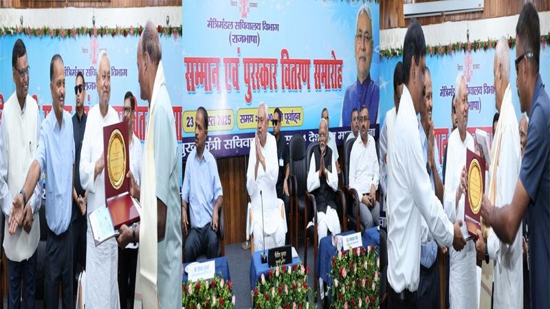 पटना : मुख्यमंत्री नीतीश कुमार ने आज मुख्यमंत्री सचिवालय स्थित ‘संवाद’ में मंत्रिमंडल सचिवालय विभाग अंतर्गत राजभाषा के द्वारा आयोजित हिंदी सेवी सम्मान पुरस्कार (2023-24) वितरण समारोह का दीप प्रज्जवलित कर उद्घाटन किया। कार्यक्रम के दौरान मुख्यमंत्री ने हिंदी सेवी सम्मान एवं पुरस्कार (2023-24) के अधीन विभिन्न श्रेणियों के लिए अखिल भारतीय स्तर पर चयनित व इस समारोह में उपस्थित 12 साहित्यकारों/संस्थाओं को पुरस्कृत किया। इसके अंतर्गत अनुसूचित जातियों एवं अनुसूचित जनजातियों की शिक्षा-दीक्षा और उनके सामाजिक एवं आर्थिक विकास में विशिष्ट योगदान के लिए जियालाल आर्य को बाबा साहब अंबेडकर पुरस्कार प्रदान किया। इसके अंतर्गत उन्हें अंग वस्त्र, प्रतीक चिन्ह एवं पांच लाख रुपए की पुरस्कार की राशि प्रदान की गई।