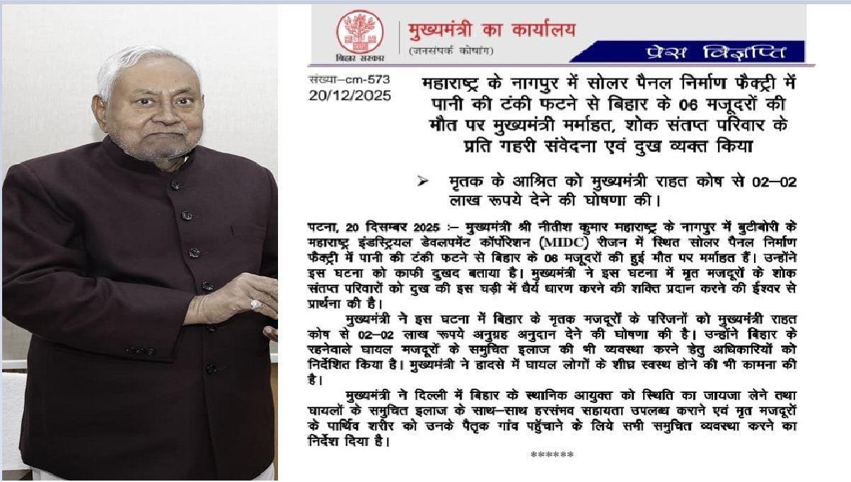 पटना, 20 दिसम्बर 2025 : मुख्यमंत्री श्री नीतीश कुमार महाराष्ट्र के नागपुर में बुटीबोरी के महाराष्ट्र इंडस्ट्रियल डेवलपमेंट कॉर्पोरेशन (MIDC) रीजन में स्थित सोलर पैनल निर्माण फैक्ट्री में पानी की टंकी फटने से बिहार के 06 मजूदरों की हुई मौत पर मर्माहत हैं। उन्होंने इस घटना को काफी दुखद बताया है। मुख्यमंत्री ने इस घटना में मृत मजदूरों के शोक संतप्त परिवारों को दुख की इस घड़ी में धैर्य धारण करने की शक्ति प्रदान करने की ईश्वर से प्रार्थना की है।