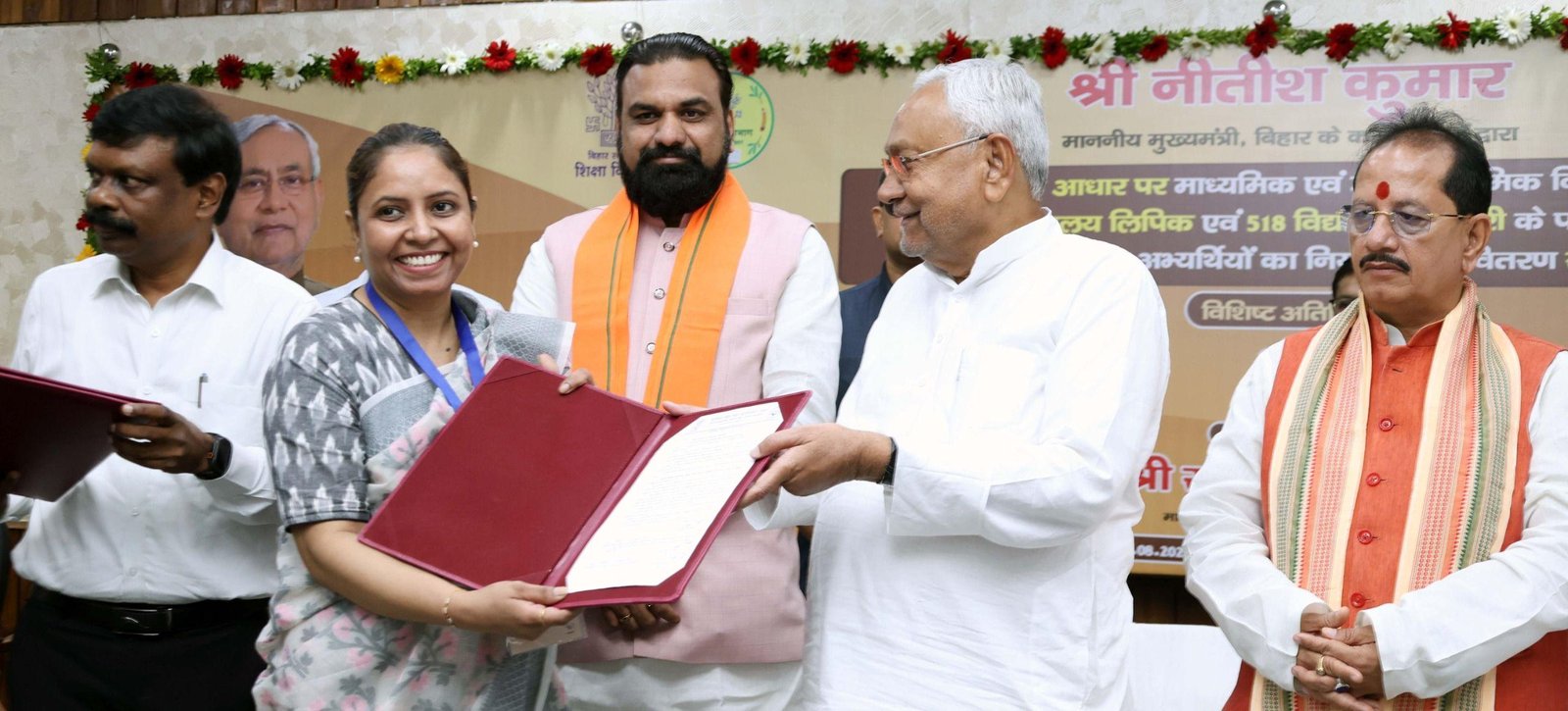 पटना: CM नीतीश कुमार ने आज मुख्यमंत्री सचिवालय स्थित ‘संवाद’ में अनुकंपा के आधार पर माध्यमिक एवं उच्च माध्यमिक विद्यालयों में 4835 विद्यालय लिपिक एवं 518 विद्यालय परिचारी के पदों पर चयनित कुल 5353 अभ्यर्थियों को नियुक्ति पत्र प्रदान किया। इस दौरान मुख्यमंत्री ने सांकेतिक रूप से मणि कुमारी, अमित गौरव, दिव्या राज, किरण कुमारी गुप्ता एवं तूबा अशरफ को नियुक्ति पत्र प्रदान किया। इस दौरान CM ने कहा कि सभी नवनियुक्त कर्मियों को मेरी हार्दिक बधाई एवं शुभकामनाएं है।