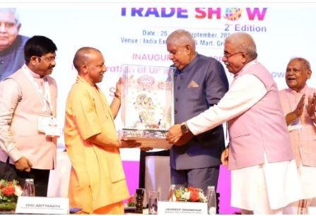 यूपी ट्रेड शो 2024 में उपराष्ट्रपति का स्वागत करते सीएम योगी आदित्यनाथ