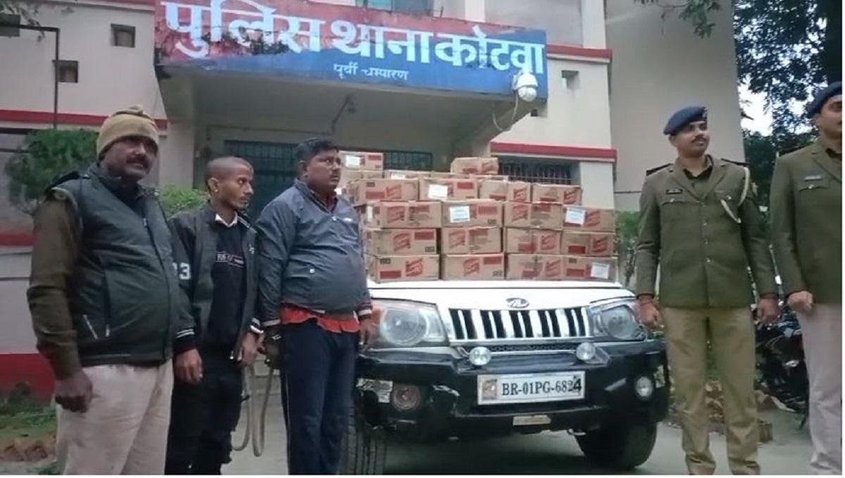 मोतिहारी (पूर्वी चम्पारण) : नए साल से ठीक पहले जिले में कानून-व्यवस्था बनाए रखने के उद्देश्य से पुलिस प्रशासन पूरी तरह सतर्क नजर आ रहा है। एसपी स्वर्ण प्रभात के आदेशानुसार पुलिस ने शराब तस्करों के खिलाफ अभियान तेज कर दिया है। इसी क्रम में कोटवा थाना पुलिस ने लगातार चौथे दिन बड़ी कार्रवाई करते हुए बोलेरो वाहन समेत 50 कार्टून अवैध शराब बरामद की है। इस कार्रवाई में दो शराब कारोबारियों को भी हिरासत में लिया गया है।