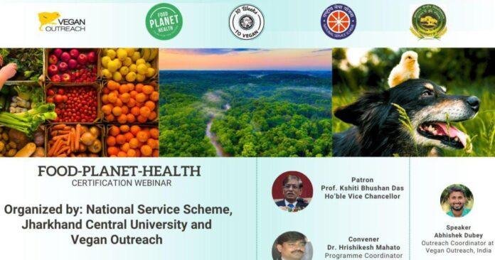 Ranchi : झारखंड केंद्रीय विश्वविद्यालय (CUJ) के राष्ट्रीय सेवा योजना (एनएसएस) और वीगन आउटरीच नामक संस्था के संयुक्त तत्वाधान में “फूड-प्लैनेट-हेल्थ” विषय पर एक वेबिनार का आयोजन किया गया। वीगन आउटरीच संस्था से अभिषेक दुबे (आउटरीच कॉर्डिनेटर) ने वेबिनार के विषय पर प्रकाश डाला। वक्ता ने बताया कि पशु-आधारित भोजन आज वैश्विक स्तर पर पर्यावरण, मानव स्वास्थ्य और पशु पक्षियों के सामने गंभीर संकट उत्पन्न कर रहा है अतः पौध-आधारित भोजन की ओर वापस मुड़ने की बड़ी आवश्यकता है।