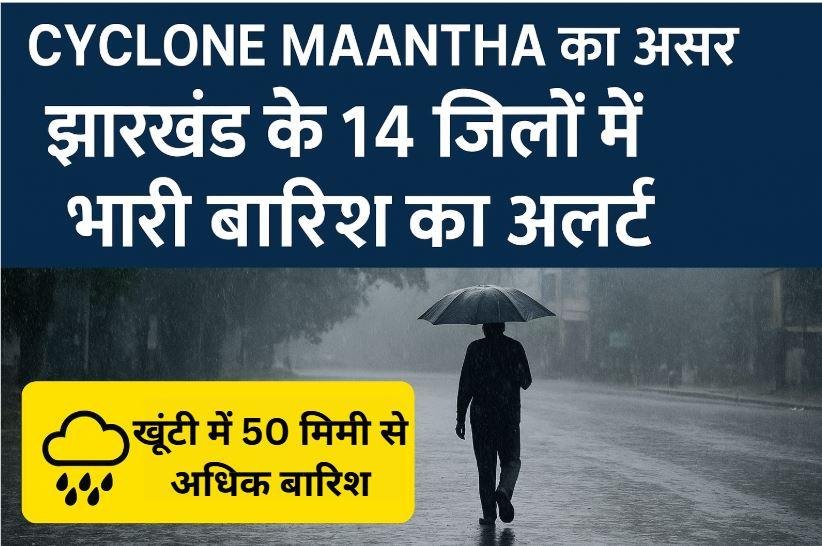 Cyclone Maantha का असर झारखंड में, खूंटी में सबसे अधिक 50 मिमी बारिश। रांची समेत 14 जिलों में भारी बारिश का येलो अलर्ट जारी, तापमान में 4 डिग्री की गिरावट।