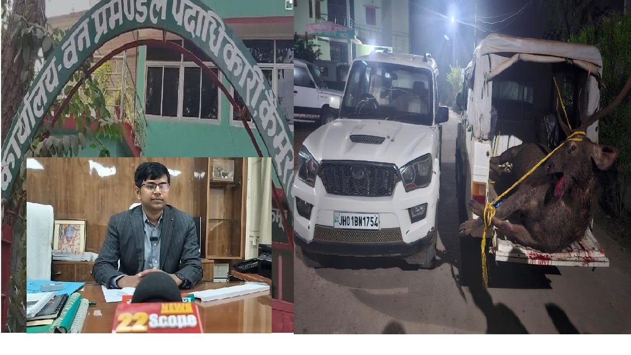 कैमूर : जिले के अधौरा पहाड़ी इलाके से वन्यजीव तस्करी का सनसनीखेज मामला सामने आया है। तस्करों ने प्रतिबंधित सांबर को दो गोली मारकर मौत के घाट उतार दिया और मांस बेचने की तैयारी कर रहे थे। बीती रात लगभग 1:30 बजे वन विभाग की गश्ती टीम ने करर एवं ताला गांव के बीच गढ़वा जंगल में छापेमारी की। मौके से करीब 250 किलो वजनी मृत सांबर, एक स्कॉर्पियो, धारदार हथियार और मांस भरने के बोरे बरामद किए गए।