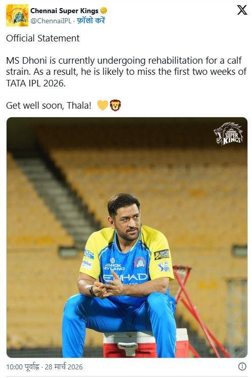 सीएसके ने अपने बयान में बताया कि धोनी फिलहाल पिंडली की मांसपेशियों में खिंचाव से उबरने के लिए रिहैबिलिटेशन प्रक्रिया से गुजर रहे हैं। मेडिकल टीम उनकी स्थिति पर लगातार नजर बनाए हुए है।