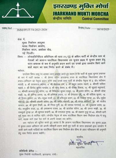 झामुमो द्वारा भेजे गए पत्र में यह भी उल्लेख किया गया है कि ये सभी नेता वायु मार्ग, सड़क मार्ग एवं रेल मार्ग से घाटशिला क्षेत्र का दौरा करेंगे। ऐसे में निर्वाचन आयोग से अनुरोध किया गया है कि सभी स्टार प्रचारकों को प्रचार के लिए अधिकृत करते हुए उनके द्वारा प्रयुक्त वाहनों के लिए आवश्यक पास निर्गत किए जाएं।