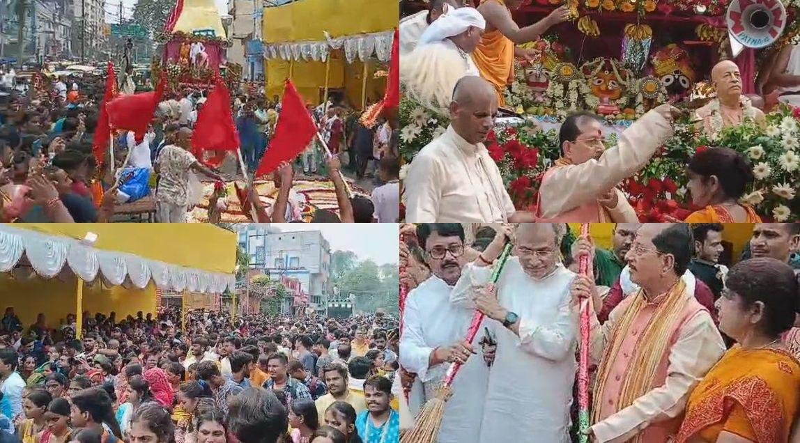 पटना: पटना में इस्कॉन मंदिर की तरफ से भव्य जगन्नाथ यात्रा निकाली गई। जगन्नाथ यात्रा की शुरुआत उप मुख्यमंत्री विजय सिन्हा ने की। विजय सिन्हा इस्कॉन मंदिर का पट खुलते ही सबसे पहले भगवान जगन्नाथ की आरती की फिर रथ के आगे सड़क पर झाड़ू लगाया। इस दौरान माहौल हरे रामा, हरे कृष्णा, जय जगन्नाथ के नारों से गूंजता रहा।