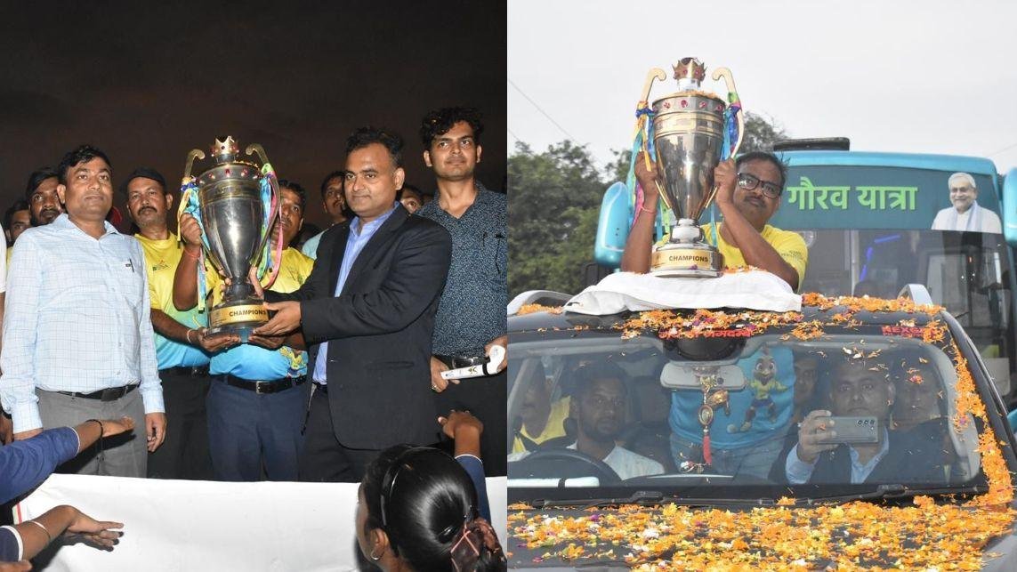 लखीसराय: नवंबर महीने में नालंदा के राजगीर में आयोजित होने वाली एशियन महिला हॉकी चैंपियनशिप का ट्रॉफी गौरव यात्रा बुधवार को लखीसराय पहुंचा। ट्रॉफी गौरव यात्रा का लखीसराय में भव्य स्वागत किया गया। लखीसराय की सीमा पर ट्रॉफी प्राप्त करने के बाद उसे गाजे बाजे के साथ कार्यक्रम स्थल पर लाया गया। कार्यक्रम स्थल पर छात्र और बैंड ने एक से एक प्रदर्शन के साथ ट्रॉफी का स्वागत किया।