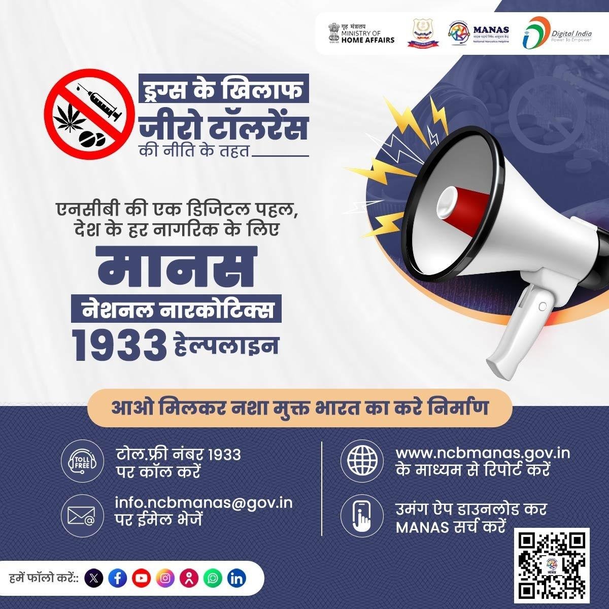 नशे की तस्करी, दुरुपयोग एवं अवैध व्यापार जैसी आपराधिक गतिविधियों की सूचना आम नागरिकों द्वारा आसानी से देने के उद्देश्य से नारकोटिक्स कंट्रोल ब्यूरो (NCB) द्वारा MANAS (Madak Padarth Nigrani Aur Suchna System) पोर्टल – https://ncbmanas.gov.in/ तथा हेल्पलाइन नंबर 1933 की शुरुआत की गई है। इस पोर्टल और हेल्पलाइन के माध्यम से कोई भी व्यक्ति ड्रग्स से संबंधित गतिविधियों की सूचना गोपनीय रूप से दे सकता है।