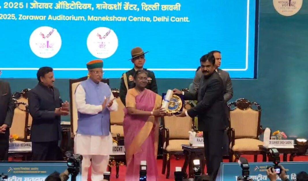 New Delhi : माननीय राष्ट्रपति द्वारा राष्ट्रीय मतदाता दिवस के अवसर पर पहली बार निर्वाचन में उत्कृष्ट प्रदर्शन हेतु झारखंड (Jharkhand) राज्य को बेस्ट परफॉर्मिंग स्टेट का नेशनल अवार्ड प्राप्त हुआ। माननीय राष्ट्रपति द्रौपदी मुर्मू ने झारखंड के मुख्य निर्वाचन पदाधिकारी के. रवि कुमार को इस हेतु नई दिल्ली के जोरावर ऑडिटोरियम, मानेकशॉ सेंटर में आयोजित राष्ट्रीय मतदाता दिवस पर आयोजित राष्ट्रीय स्तर के कार्यक्रम में सम्मानित किया।
