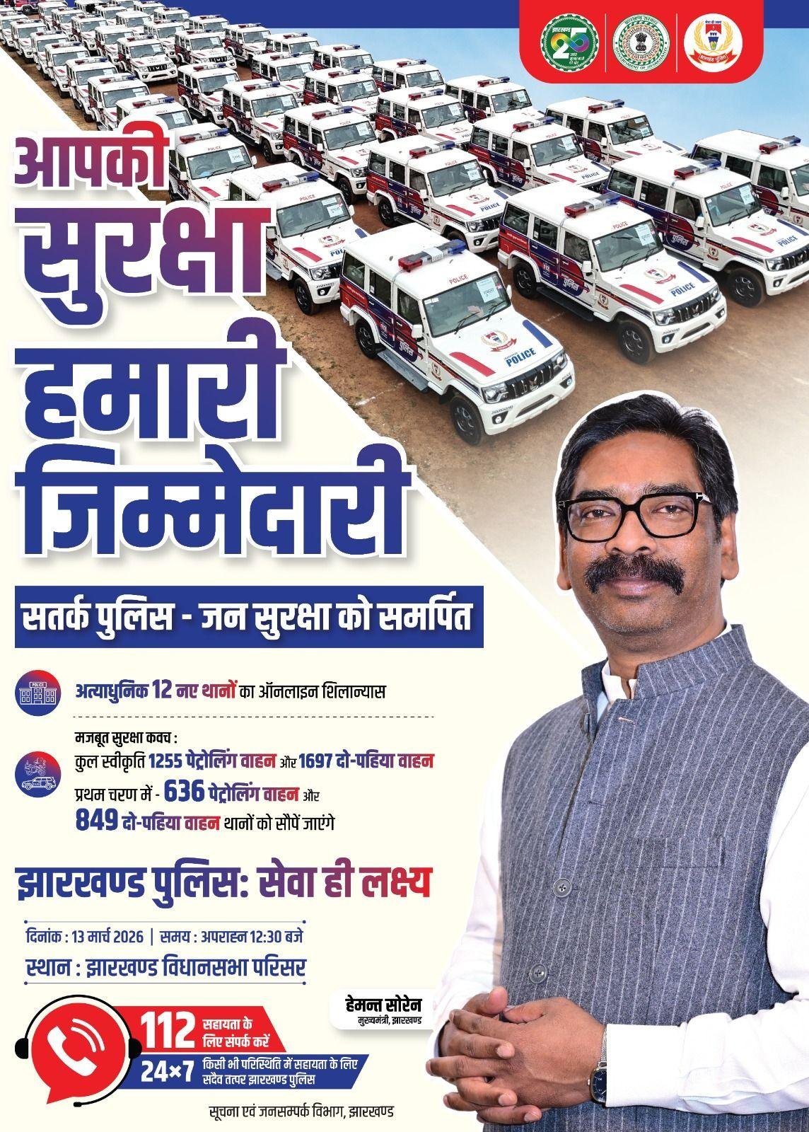 Jharkhand वासियों की सुरक्षा को और मजबूत करने के उद्देश्य से अबुआ सरकार ने राज्य के सभी थानों के लिए 1255 चार पहिया वाहन एवं 1697 दो पहिया वाहन स्वीकृत किए हैं। पहले चरण में 636 चार पहिया और 849 दो पहिया वाहन खरीदे जा चुके हैं, जिन्हें 13 मार्च 2026 को विभिन्न थानों को सौंपा जा रहा है ।साथ ही 12 जिलों में अत्याधुनिक सुविधाओं से युक्त 12 संयुक्त थाने (एक ही परिसर में महिला थाना, साइबर थाना, AHTU थाना, एवं SC/ST थाना) के निर्माण की भी शुरुआत की जा रही है। यह पीडि़त-केन्द्रित पुलिसिंग व्यवस्था के लिए अबुआ सरकार की पहल है।