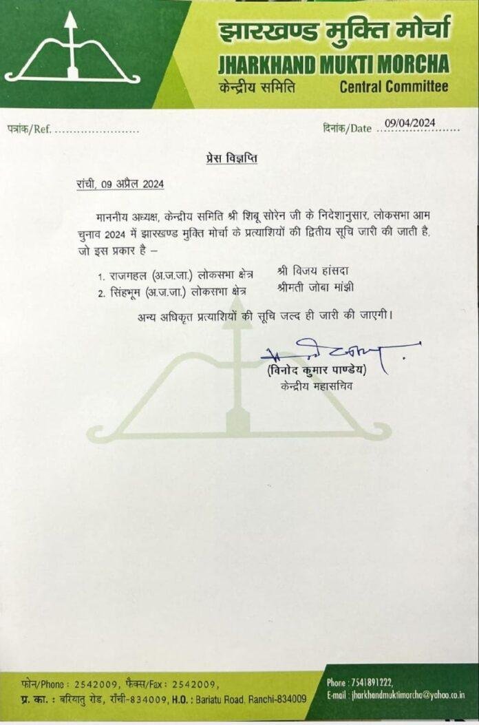 रांचीः लोकसभा चुनाव को लेकर JMM ने अपनी दूसरी लिस्ट जारी कर दी है। JMM ने राजमहल और सिंहभूम सीट से अपने उम्मीदवारों की घोषणा कर दी है।