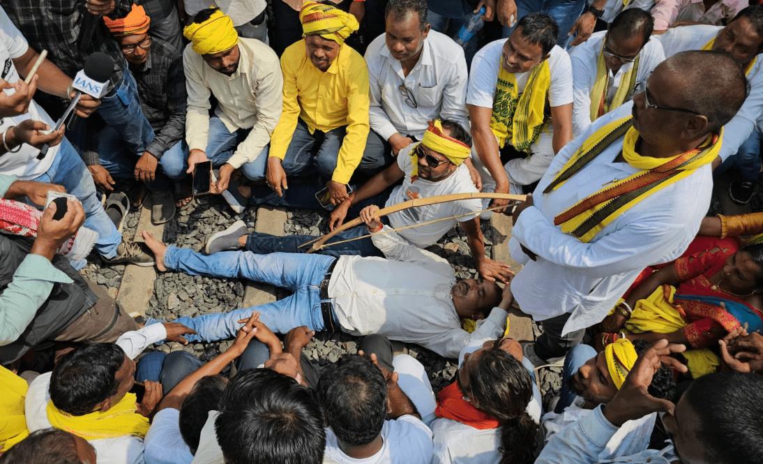 Hazaribagh : कुड़मी समाज के द्वारा आज झारखंड सहित बंगाल, उड़ीसा में ‘रेल टेका डहर छेका’ आंदोलन किया जा रहा है। इस दौरान सभी राज्यों में कई रेलवे स्टेशनों पर समाज के द्वारा रेल पटरी पर धरना प्रदर्शन किया जा रहा है। इसी दरमियान आज मांडू विधायक तिवारी महतो रामगढ़ जिले के चरही रेलवे स्टेशन पर अचानक पटरी पर ही लेट गए और प्रदर्शन करने लगे।