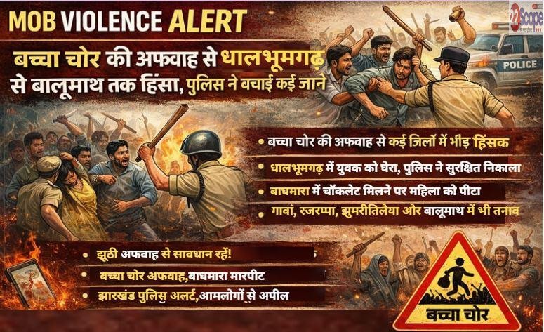 Mob Violence Alertरांची:  झारखंड के विभिन्न जिलों में इन दिनों बच्चा चोर की अफवाह ने खतरनाक रूप ले लिया है। संदेह के आधार पर भीड़ कानून हाथ में ले रही है और निर्दोष लोगों को निशाना बना रही है। मंगलवार को धालभूमगढ़ से लेकर बाघमारा और बालूमाथ तक अलग-अलग घटनाओं में मानसिक रूप से बीमार, रास्ता भटके और अनजान लोगों के साथ मारपीट की गई।