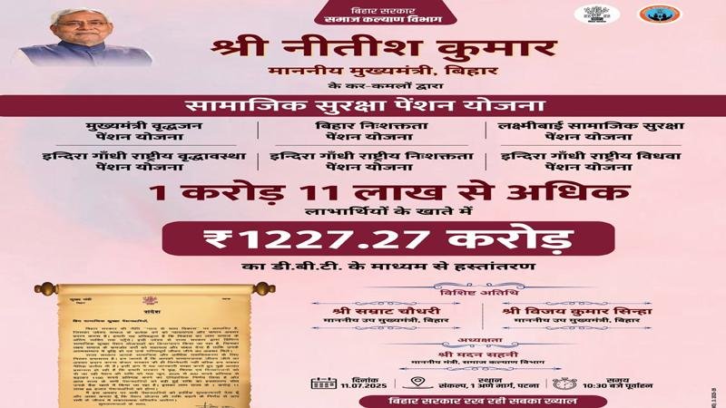 पटना : बिहार के मुख्यमंत्री नीतीश कुमार (Nitish Kumar) आज यानी 11 जुलाई को एक ऐतिहासिक कदम उठाने जा रहे हैं। सामाजिक सुरक्षा पेंशन योजना के तहत एक करोड़ 11 लाख लाभार्थियों के बैंक खातों में 1227 करोड़ रुपए की राशि डायरेक्ट बेनिफिट ट्रांसफर (DBT) के जरिए ‘खटाखट’ ट्रांसफर की जाएगी। इस बार पहली बार लाभार्थियों को 400 रुपए की जगह 1100 रुपए की बढ़ी हुई पेंशन मिलेगी। इस मेगा आयोजन को बिहार सरकार पूरे राज्य में उत्सव की तरह मना रही है, जिसमें 60 लाख से अधिक लोग शामिल होंगे। लेकिन, यह लाभ कैसे मिलेगा और कौन इसका हकदार है।