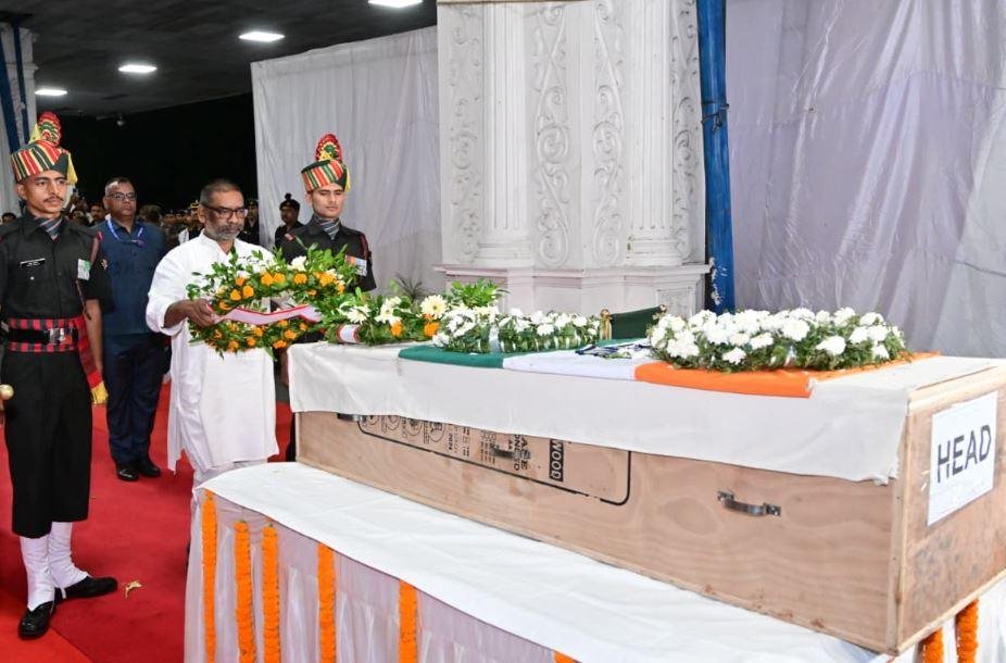 Ranchi : राज्यपाल संतोष कुमार गंगवार एवं माननीय मुख्यमंत्री हेमंत सोरेन आज बिरसा मुंडा एयरपोर्ट, रांची परिसर पहुंचकर जम्मू-कश्मीर के लद्दाख (सियाचिन) में शहीद हुए देवघर जिला के मधुपुर स्थित कजरा गांव निवासी अग्निवीर नीरज कुमार चौधरी के पार्थिव शरीर पर पुष्पचक्र अर्पित कर उन्हें भावपूर्ण श्रद्धांजलि दी।