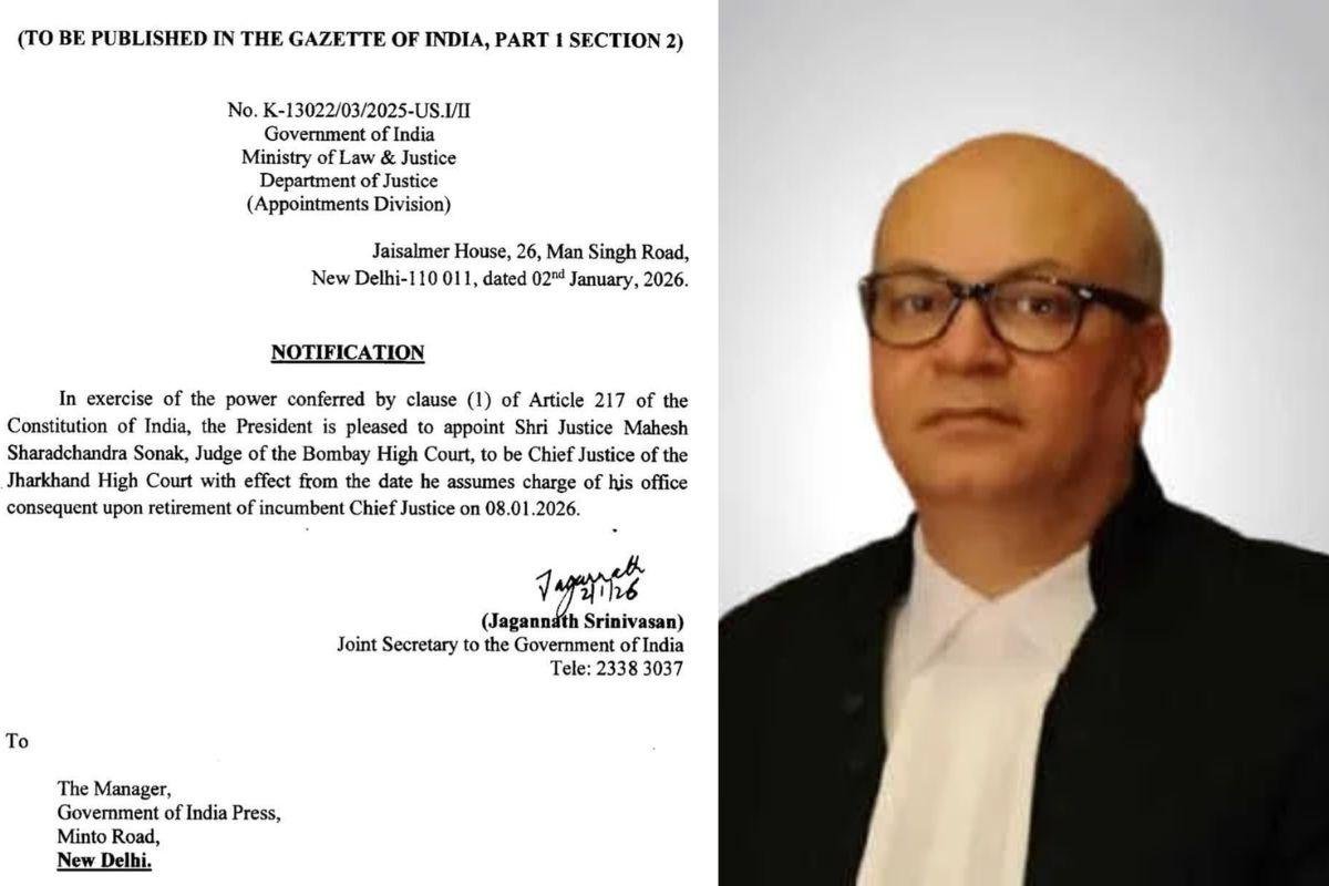 Ranchi News: मुंबई हाईकोर्ट के न्यायाधीश जस्टिस एम एस सोनक (ms sonak) को झारखंड हाईकोर्ट का चीफ जस्टिस नियुक्त किये जाने पर मुहर लग गई है. जानकारी के लिए बता दें, राष्ट्रपति द्रौपदी मुर्मू की स्वीकृति के बाद केंद्रीय कानून मंत्रालय ने यह अधिसूचना जारी की थी. कयास लगाई जा रही है कि 8 जनवरी को जस्टिस एम एस सोनक झारखंड हाईकोर्ट में पदभार संभाल सकते हैं. 8 जनवरी को झारखंड हाईकोर्ट के मौजूदा चीफ जस्टिस तरलोक सिंह चौहान सेवानिवृत्त होने जा रहे हैं.
