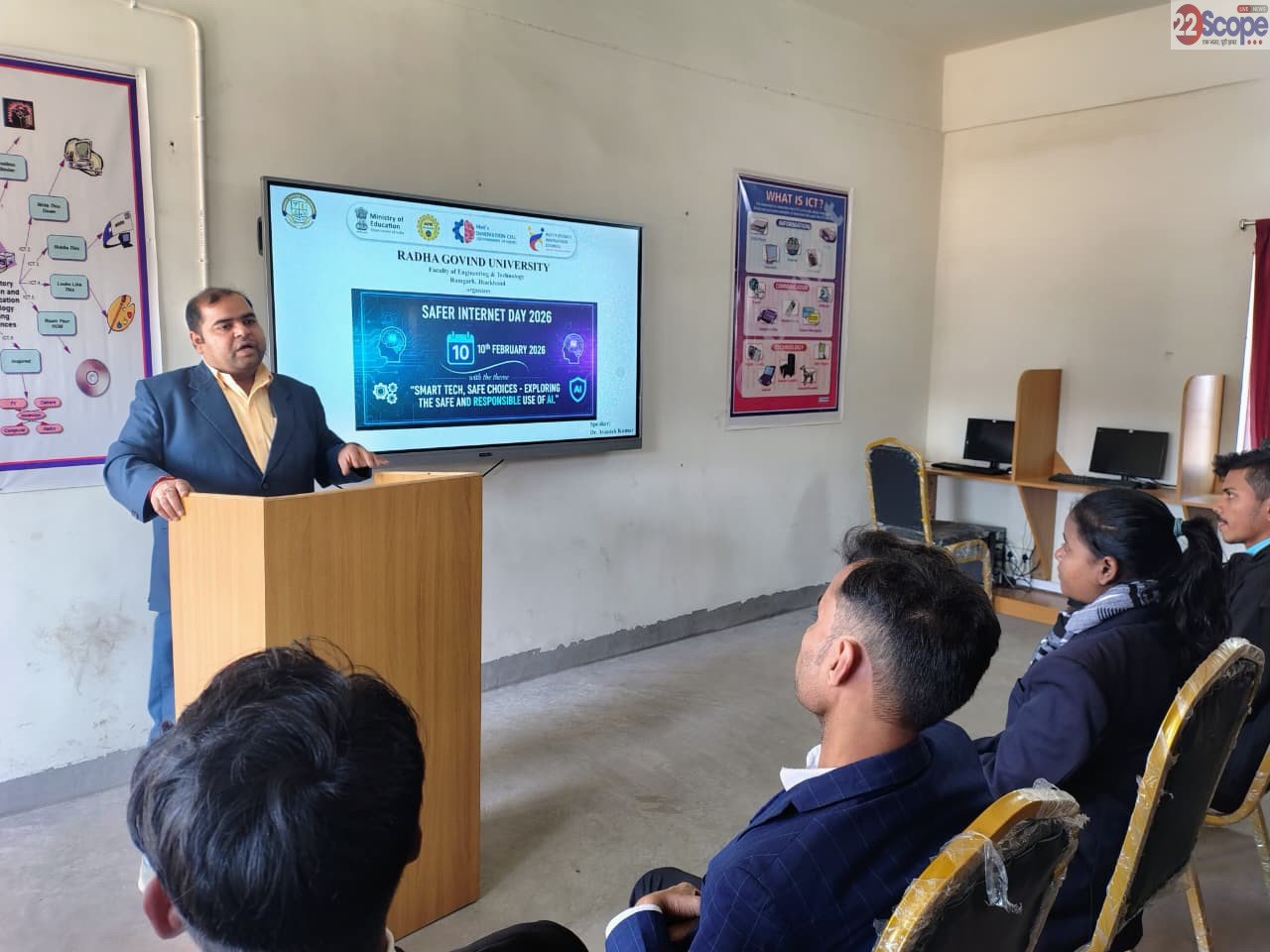 Ramgarh: Radha Govind University के फैकल्टी ऑफ इंजीनियरिंग एंड टेक्नोलॉजी द्वारा मंगलवार को ‘सेफर इंटरनेट डे 2026’ के अवसर पर “स्मार्ट टेक, सुरक्षित विकल्प – एआई के सुरक्षित एवं जिम्मेदार उपयोग की खोज” विषय पर जागरूकता कार्यक्रम का आयोजन किया गया। कार्यक्रम का उद्देश्य विद्यार्थियों को कृत्रिम बुद्धिमत्ता (एआई) के सुरक्षित, नैतिक और जिम्मेदार उपयोग के प्रति जागरूक करना था।