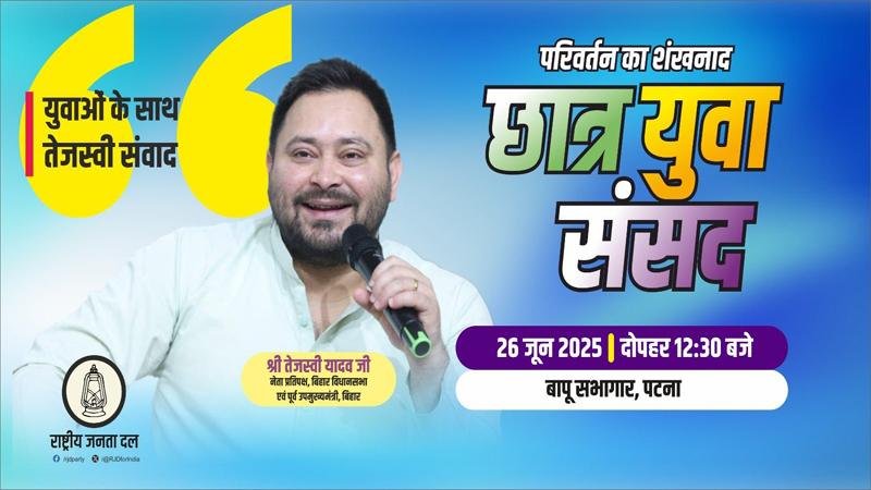 पटना/गयाजी : बिहार में नेता प्रतिपक्ष व पूर्व डिप्टी सीएम तेजस्वी यादव (Tejashwi Yadav) आज यानी 26 जून को राजधानी पटना के बापू सभागार में ‘छात्र युवा संसद’ कार्यक्रम करने वाले हैं जिसमें वह 10 हजार युवाओं को कलम बांटने वाले हैं। तेजस्वी यादव ने सोशल मीडिया एक्स पर पोस्ट लिखकर आज के कायक्रम के बारे में विस्तृत से बताया है। साथ ही वह बिहार की डबल इंजन सरकार, सीएम नीतीश कुमार और पुलिस प्रशासन पर कई सवाल खड़े किए हैं। तेजस्वी ने छात्रों के भविष्य को लेकर भी चिंता जतायी है।
