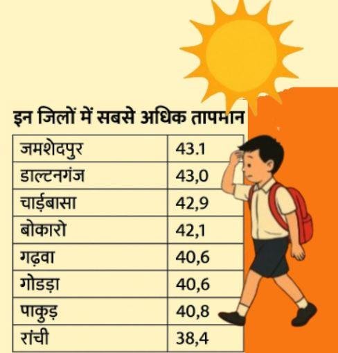 गुरुवार को जमशेदपुर प्रदेश का सबसे गर्म शहर रहा, जहां तापमान 43.1 डिग्री रिकॉर्ड किया गया। अन्य जिलों में भी हालात कम विकराल नहीं हैं: