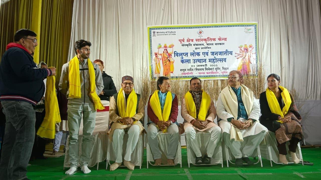 मुंगेर: शुक्रवार को मुंगेर के शगुन गार्डन में संस्कृति मंत्रालय भारत सरकार द्वारा विलुप्त लोक एवं जनजातीय कला उत्थान महोत्सव का आयोजन किया गया। कार्यक्रम का उद्घाटन भाजपा विधान पार्षद लाल मोहन गुप्ता, शास्त्री गुरु ग्रिरिंद चंद्र पाठक, रंगकर्मी महेश अंजना ने दीप प्रज्वलित कर किया। इस मौके पर भाजपा विधान पार्षद लाल मोहन गुप्ता कहा कि हमारे गांव व समाज से विलुप्त हो रही संस्कृति एवं गीत- संगीत को लेकर उसके उत्थान को लेकर भारत सरकार के संस्कृति विभाग द्वारा इस तरह कार्यक्रम का आयोजन कर उसे जागरूक करने का प्रयास किया जा रहा है।