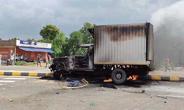 गढ़वा में आक्रोशित लोगों ने पिकअप में लगाई आग