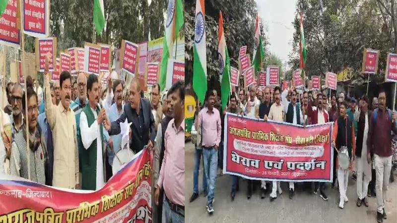 सीतामढ़ी : सीतामढ़ी के शिक्षक संघ अब शिक्षा विभाग से दो-दो हाथ करने के मूड में है। हालात यह है कि विभाग में व्याप्त भष्ट्राचार के खिलाफ शिक्षकों ने अनोखा रास्ता अपनाया है। सीतामढ़ी के जिला मुख्यालय डुमरा में शिक्षक संघ के नेतृत्व में सैकड़ों की तादाद में शिक्षकों ने पैदल मार्च किया और सीतामढ़ी के डीईओ का घेराव किया। इस दौरान शिक्षकों के हाथों में ढोलक, झाल, नगाड़ा और कीर्तन समेत दूसरे वैसे वाद्य यंत्र थे जिनको वो बजा रहे थे।